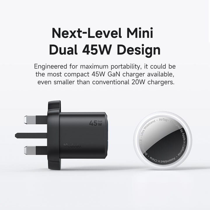 شاحن صغير بالحجم – قوي بالأداء  شاحن جداري GaN بقدرة 45 واط من Mcdodo بمنفذين USB-C، يدعم تقنيات الشحن السريع الحديثة مثل PD 3.0 / PPS / QC 3.0 ويشحن أغلب الهواتف، التابلت والأجهزة المحمولة بكفاءة عالية، مع حجم ميني يناسب الاستخدام اليومي والسفر.