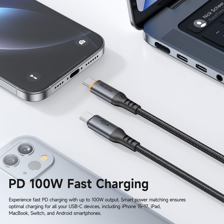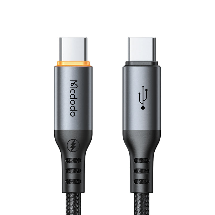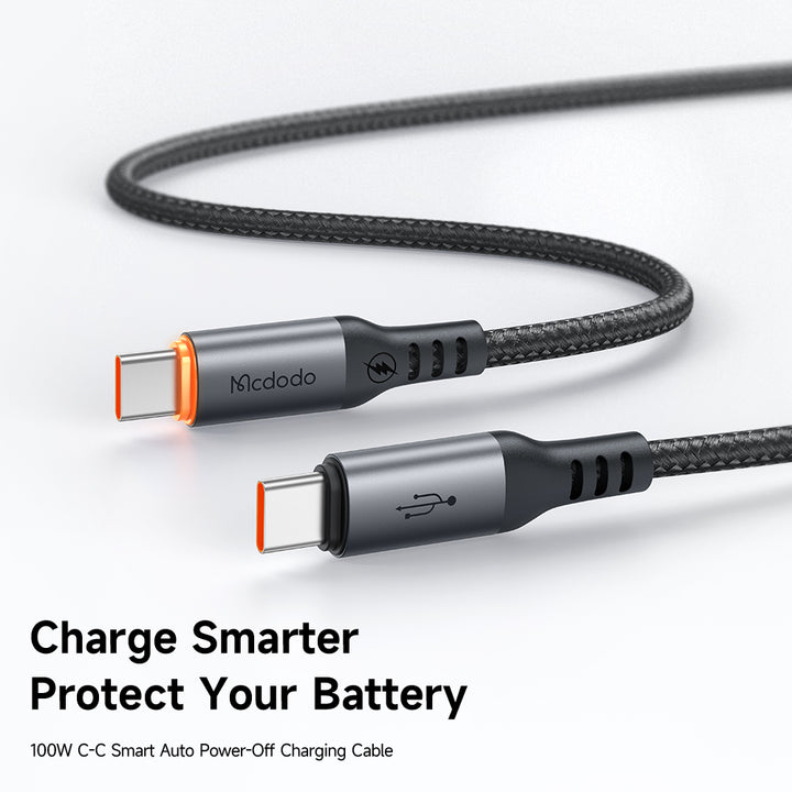شحن ذكي يحافظ على بطارية أجهزتك كيبل Mcdodo Cab Smart بقدرة 100W من نوع Type-C إلى Type-C مزود بخاصية إيقاف الشحن التلقائي لحماية البطارية، مناسب لشحن اللابتوبات، التابلت والهواتف الداعمة لتقنية PD بسرعة وأمان.