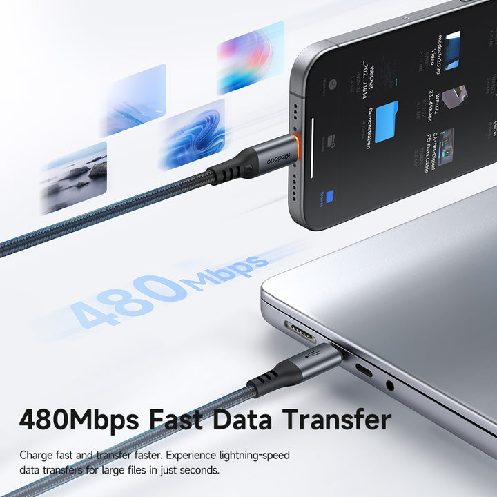 الكيبل يدعم قدرة تصل حتى 100W / 5A عبر Power Delivery، مما يجعله مناسب لشحن اللابتوبات Type-C، التابلت، والهواتف الحديثة بسرعة عالية وثبات ممتاز. استخدمه مع شاحن PD قوي لتحصل على أقصى أداء شحن ممكن.