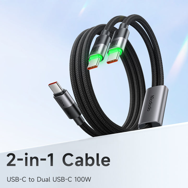 كابل واحد يشحن جهازين – Mcdodo كيبل شحن 2 في 1 USB-C إلى مزدوج USB-C بقدرة تصل إلى 100 واط، مصمم لشحن جهازين تايب-سي في نفس الوقت من منفذ واحد فقط، مع توزيع ذكي للطاقة، وكابل مضفّر متين بطول 1.5 متر يناسب اللابتوبات، التابلت، الهواتف والأجهزة الأخرى أثناء العمل أو السفر.