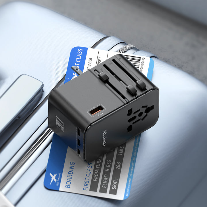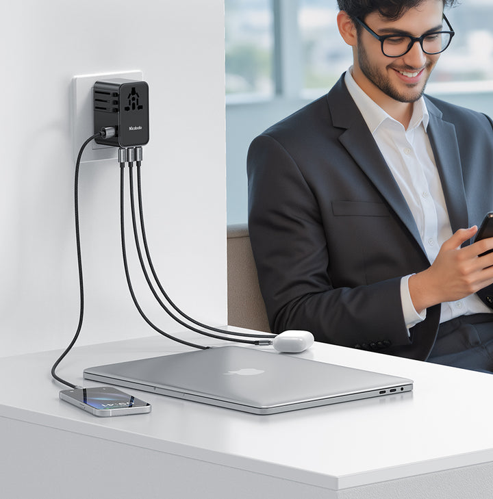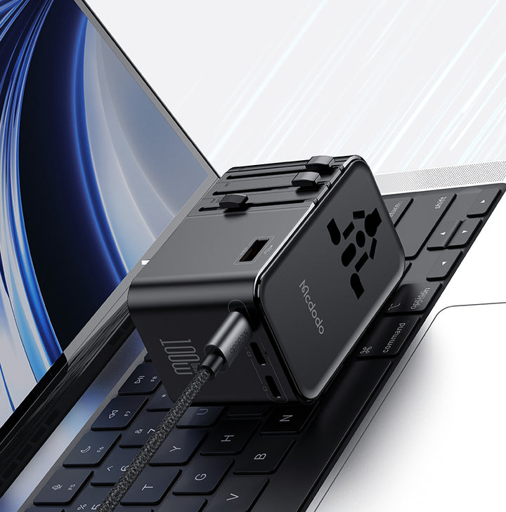 شاحن السفر اللي يغنيك عن كل المحولات – Mcdodo محول سفر عالمي بقدرة 100 واط مع ٣ منافذ USB-C ومخرج USB-A، يدعم الشحن السريع لأغلب الأجهزة الحديثة، ويكفيك عن حمل أكثر من شاحن وأكثر من فيشة في البيت، المكتب أو أثناء السفر حول العالم.