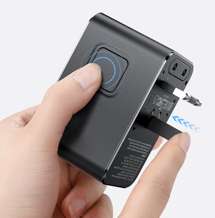تصميم Universal Travel Adapter مع فيش متعددة (مثل EU / UK / US / AU حسب الإصدار) يخليك تستخدم الشاحن في أغلب دول العالم بدون ما تحتاج تشيل محولات إضافية. سويتش جانبي يسمح لك باختيار الفيشة المطلوبة مع نظام قفل أمان عشان تبقى الفيشة ثابتة أثناء الاستخدام – مثالي للسفر، الفنادق، المكاتب والمطارات.