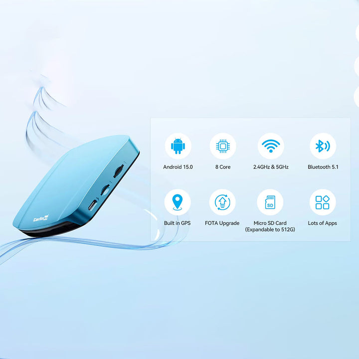 حوّل شاشة سيارتك إلى نظام Android 15 كامل مع Carlinkit AI Box Max 5G. تشغيل Netflix وYouTube وخرائط Google لاسلكيًا، مع دعم CarPlay وAndroid Auto وأداء سريع بمعالج Qualcomm.